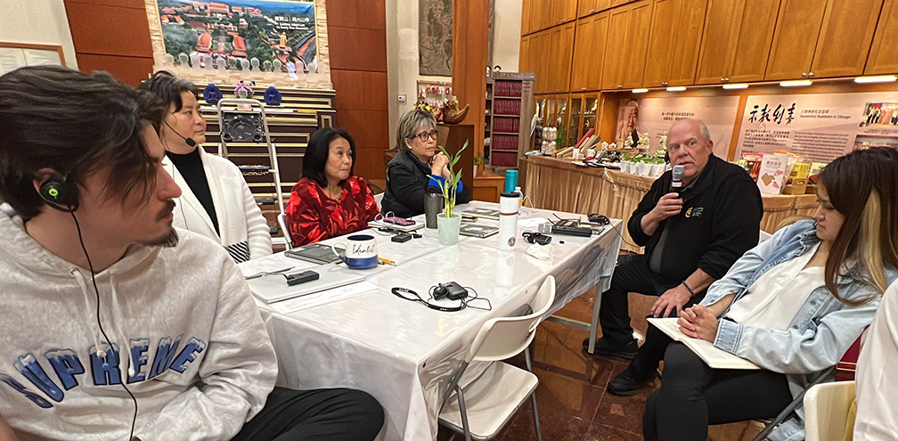 中文組由芝加哥協會會長王克英、副會長馮漢忠、第三分會會長王彬及妙偉法師帶領,探討書中〈觀音心〉、〈觀音緣〉、〈觀音管理〉與〈觀音力〉等四章節。會長王克英分享,觀音菩薩以「圓滿眾生所願」為宗旨,慈悲源於同理心;副會長馮漢忠談〈觀音緣〉,指出修行應以「自利利他、上求佛道,下化眾生」為方向;第三分會會長王彬分享〈觀音管理〉,強調以「信、願、行」和「四給」為原則,從心出發;妙偉法師講述〈觀音力〉時指出:「菩薩不在遙遠彼岸,而在我們願意付出、願意慈悲的那一刻。」