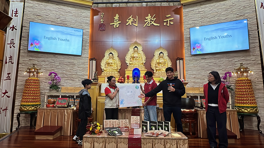 英文組由督導Steve Harverkos 主持,探討〈普門品〉與原始佛教教義;青年組由白象幹部 Celine Wang 帶領,從經文反思:「今天我最清楚聽見哪些『世間的聲音』?」整組合力透過大字報繪畫出觀音菩薩觀照「世間音」的慈悲精神。