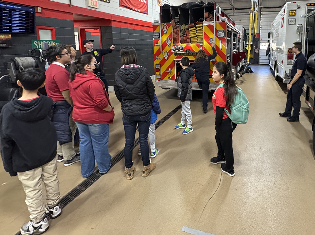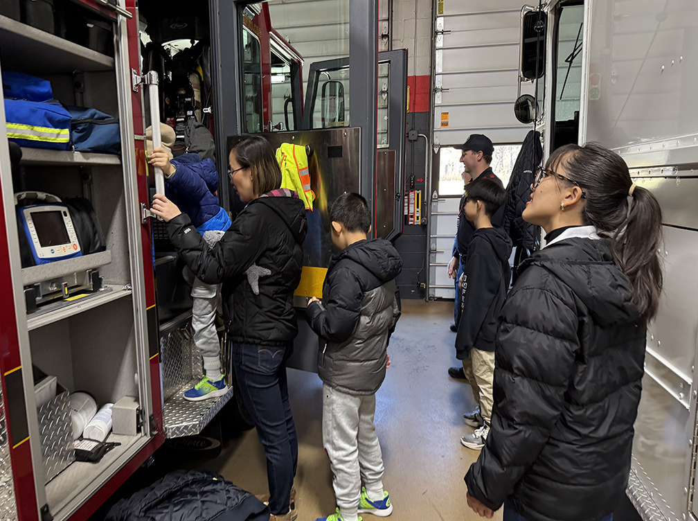 在消防局,消防人員接過禮籃與祝福卡後,隨即帶領團隊參觀消防車與救援器材,介紹日常訓練與出勤流程。學員們登上消防車、近距離觀察裝備,充分了解消防員的專業與膽識。正當參觀接近尾聲,消防隊突然接獲緊急出勤通知,消防車伴隨警笛聲迅速駛離,讓孩子們真切感受到消防工作的即時與重要,也為這趟行程留下深刻印象。