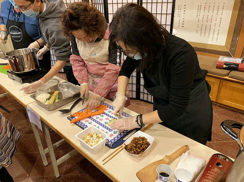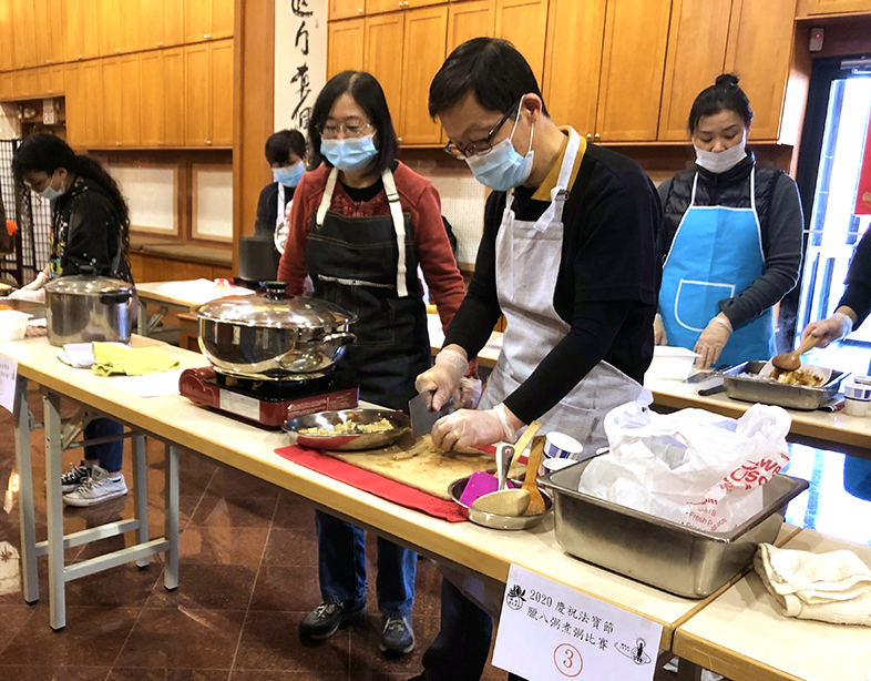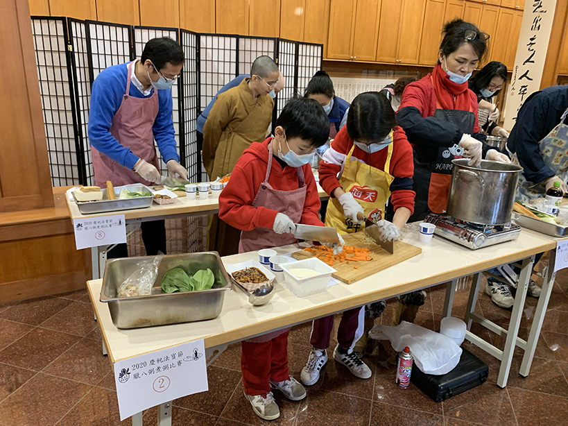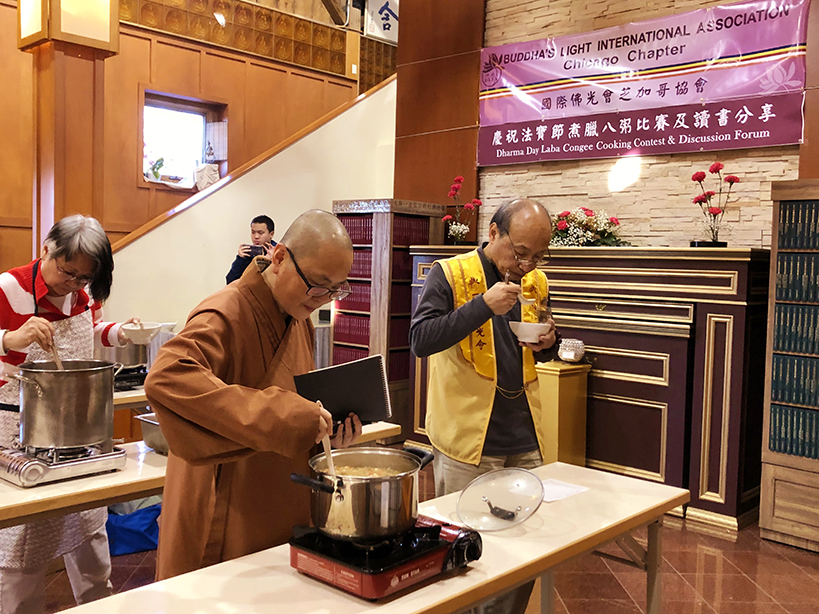 今年是芝加哥佛光山第一次舉辦煮臘八粥比賽,共有13組參賽。其中有夫妻檔、父子檔、母女檔、或同參道友、親朋好友等組成的隊伍。活動當天義工們不畏芝加哥的嚴寒,一大早就來到佛堂,歡喜地準備煮臘八粥所需的材料。以確保食材一定要新鮮,才可以煮出食物的原味。用花生、蓮子、豆腐、白果、青菜、紅蘿蔔等,熬成臘八粥,以紀念佛陀於是日成道。這一碗臘八粥,展現著佛教的酥陀妙味。