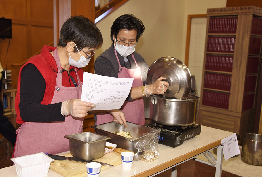 在一個半小時比賽過程中,各組依照臘八粥製作方法及心得體會,煮出萬千滋味,更留下一段特別的元旦回憶。隨即進入評審階段,首先由覺麟法師、有恆法師、協會會長周邁平及大寮典座組長王麗兒進行品嘗與評分,再由所有參賽者及在場大眾們進行品嘗及票選。從評審們臉上不時傳出驚喜讚賞地表情,就可預知雖然相同的食材,在不同的人、不同的調和與用心之下,所呈現出的不同風味與驚喜。