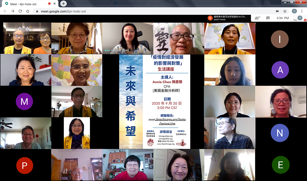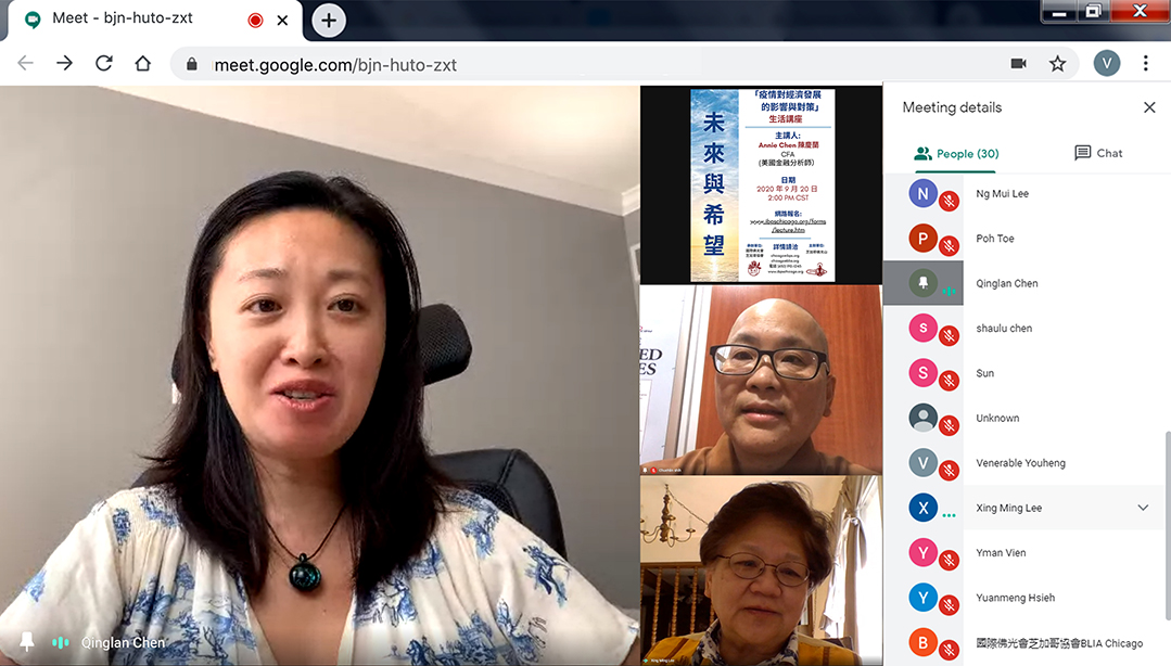 住持覺麟法談到:佛教講心安身就安,生活要懂得居安思危,由專業引導計劃未來。芝加哥佛光山自疫情以來,已多次舉辦線上佛學講座與生活講座,為佛光會員和大眾在的環紛擾境下,以佛法與民生課題安頓身心。陳慶蘭居士現任於世界最大證券、金融投資公司之一的美林集團(Merrill Lynch)。陳居士從專業的角度介紹:美國是一個由消費托起的經濟體,了解未來的消費主體,將會是我們無論在投資、找工作、或者尋找商機中,必需考慮的因素。