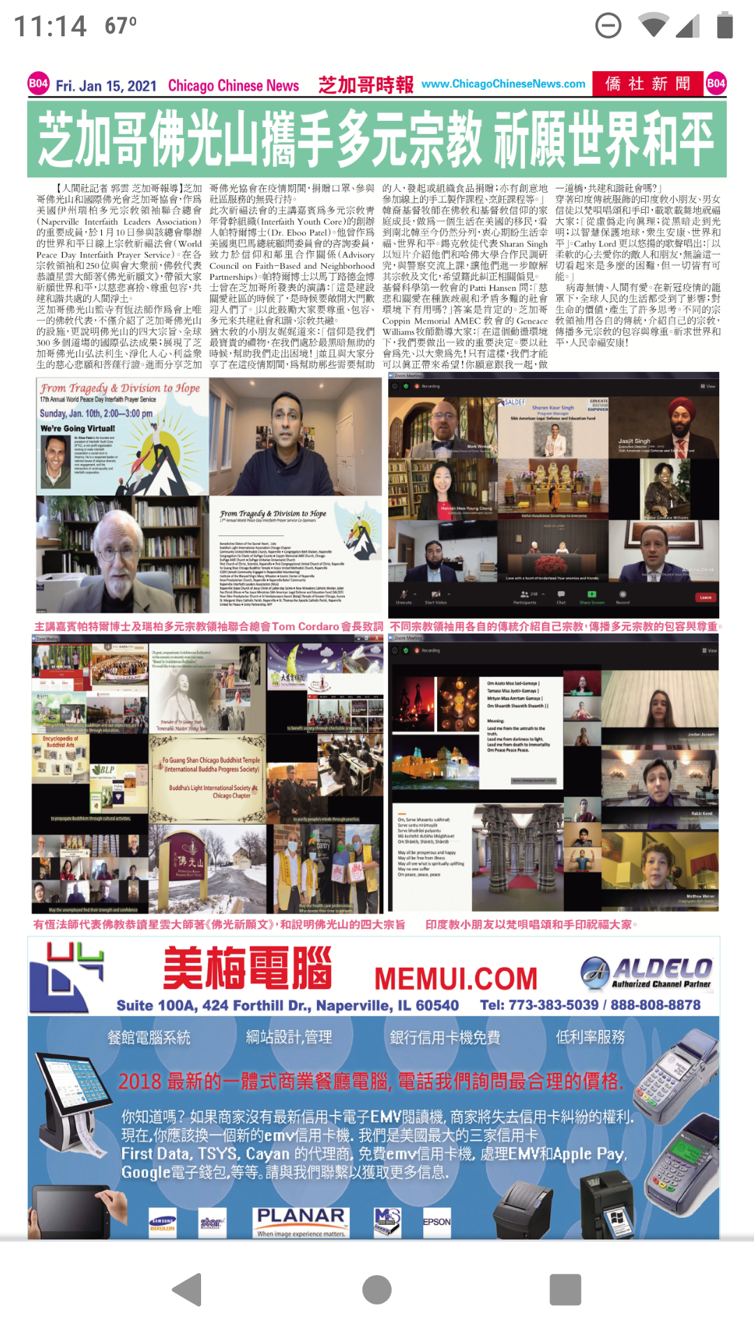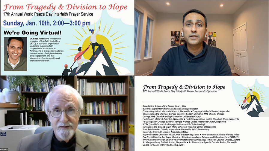 【人間社記者 郭雲 芝加哥報導】芝加哥佛光山和國際佛光會芝加哥協會,作為美國伊州瑞柏多元宗教領袖聯合總會(Naperville Interfaith Leaders Association)的重要成員,於1月10日參與該總會舉辦的世界和平日線上宗教祈福法會(World Peace Day Interfaith Prayer Service)。在各宗教領袖和250位與會大眾前,佛教代表恭讀星雲大師著《佛光祈願文》,帶領大家祈願世界和平,以慈悲喜捨、尊重包容,共建和諧共處的人間淨土。