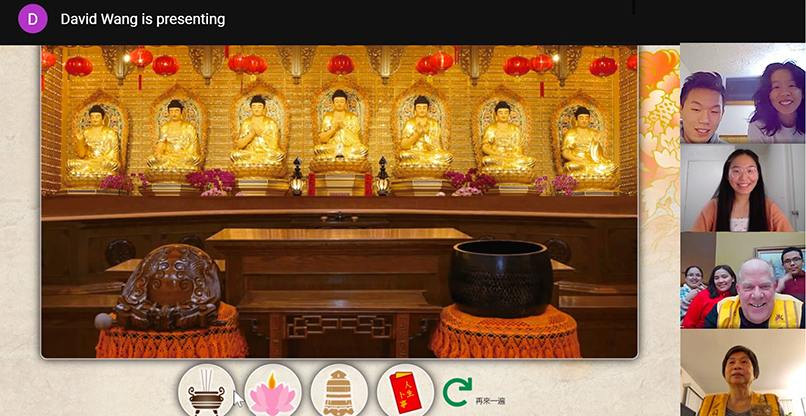 新科技,新玩法。「2021北美佛光山新年活動」網站(www.fgsna.org),全球首次線上祈願祝禱於除夕夜全面啟動,開通48小時即有上萬人次瀏覽。在線參訪佛光山在北美洲的近30座寺院道場,雲端走春,探索大千世界。伴隨著心定和尚唱誦的〈佛祖保佑〉的梵音妙樂,民眾可在每一座道場的大雄寶殿內,佛前上香、獻燈祈福、叩鐘許願,更能抽取新年法語,啟發智慧。在本次雲端團拜上,芝加哥青年分團貼心地用中英雙語線上同步教學如何線上祈福,使能男女老少都能在網絡上暢通無礙,參訪十方。