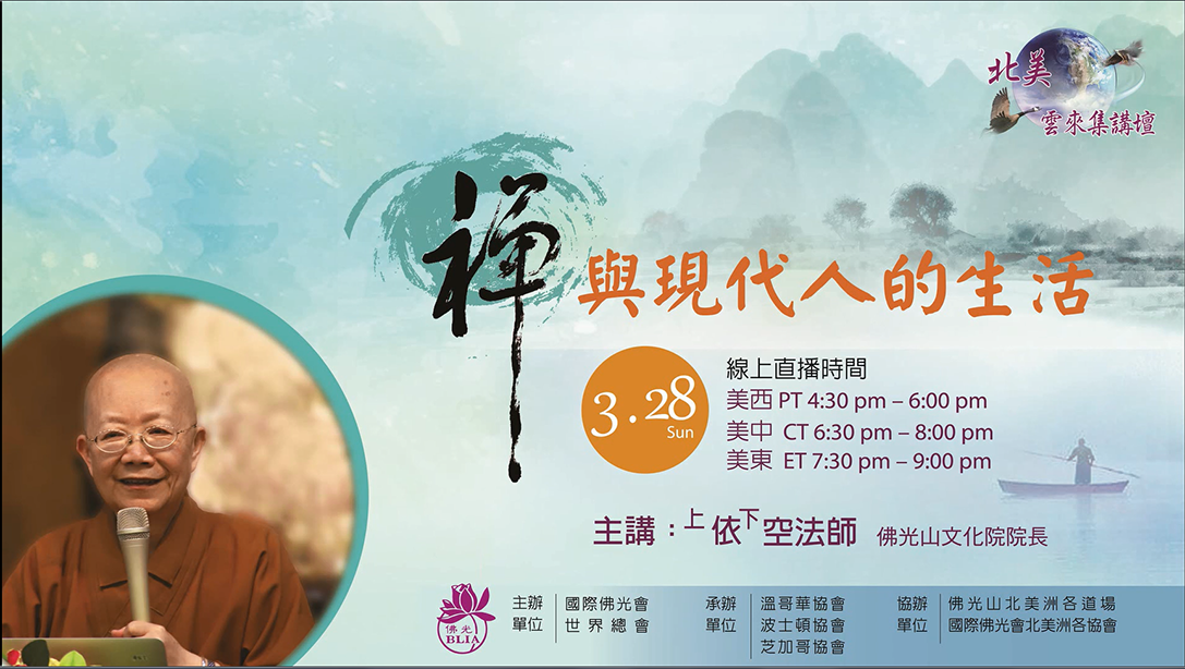 國際佛光會北美各協會聯合舉辦2021「北美雲來集講壇」系列講座。第一場雲端講座,禮請到佛光山文化院院長依空法師講授「禪與現代人的生活」。教導大眾如何運用佛法智慧,面對生活中的種種考驗與挑戰。目前,已超过萬人線上聆聽,共享法益。