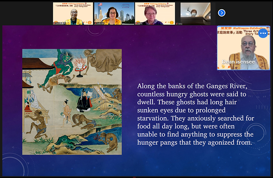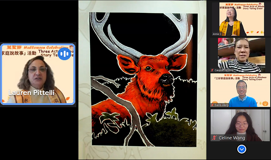 英文分會委員Dean Isensee以星雲大師著《佛教叢書-佛陀》跟大眾分享「慳貪墮餓鬼」的故事,要時時受持五戒十善、六度萬行才不會墮入三惡道中。委員Lauren Pittelli講述《本生經》的故事「金鹿王和商人的兒子」,商人的兒子貪圖財富而違背誓言告知國王金鹿王的下落,金鹿王慈悲請求國王不要殺商人的兒子,並且請求國王不要殺害國内的野生動物, 智慧的金鹿王為國家帶來豐足與和平。