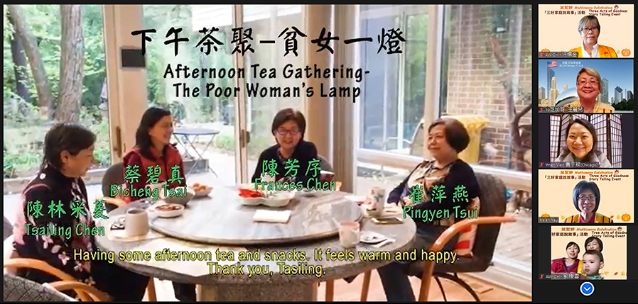 第一分會馬寶福師兄和女兒Megan Ma,爲大家講了「瞎子打燈籠」的故事,外在的燈籠可能會熄滅, 但我們内在的那盞慈悲智慧的明燈是不會熄滅的。林采菱會長、 理事崔萍燕、謝芳媛,幹部陳芳序和蔡碧真以輕鬆的茶會方式,為孫輩講述了「貧女一燈」的故事,行布施的時候, 不在金額高低, 數量多寡, 而是在那一顆心, 若是純淨無染著為利益大衆的發心。