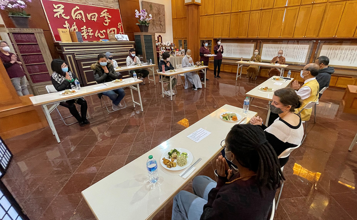 在疫情期間,常住做好了完全的防疫措施。特別以方便過堂的方式,讓學生們能過體驗傳統叢林的過堂用餐。菜色上更是獨具匠心,製作酸甜苦辣不同口味。同學們全部都選擇筷子用餐,體驗三德六味。住持覺麟法師開示,過堂要五觀想,計功多少,量彼來處;忖己德行,全缺應供。人生也猶如過堂一般,不執著、不偏愛,過去了,就要放下。