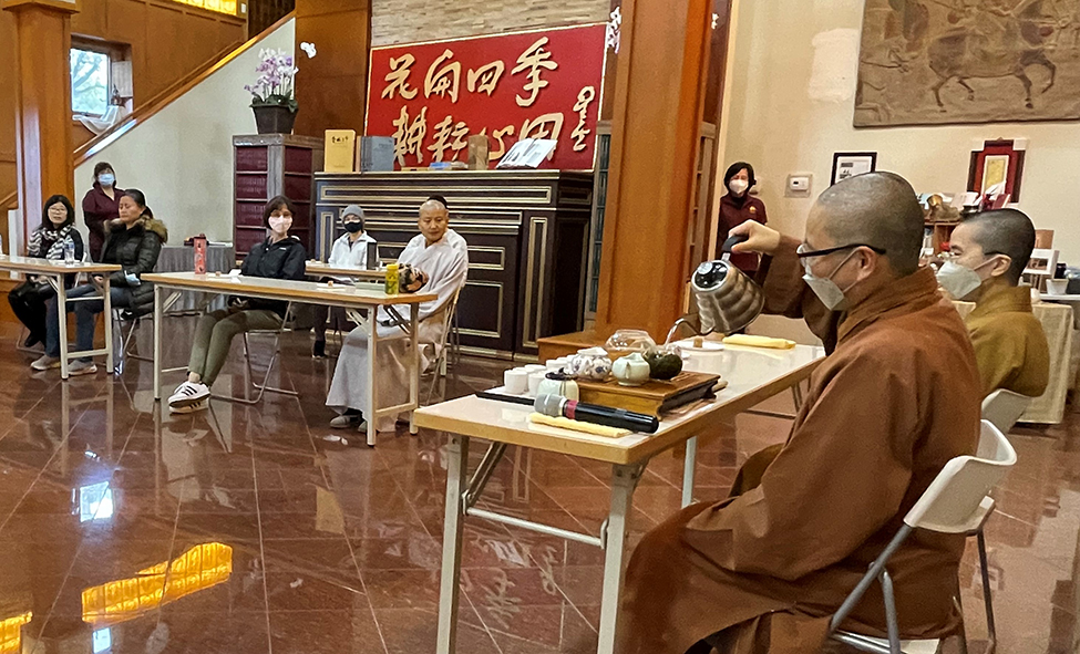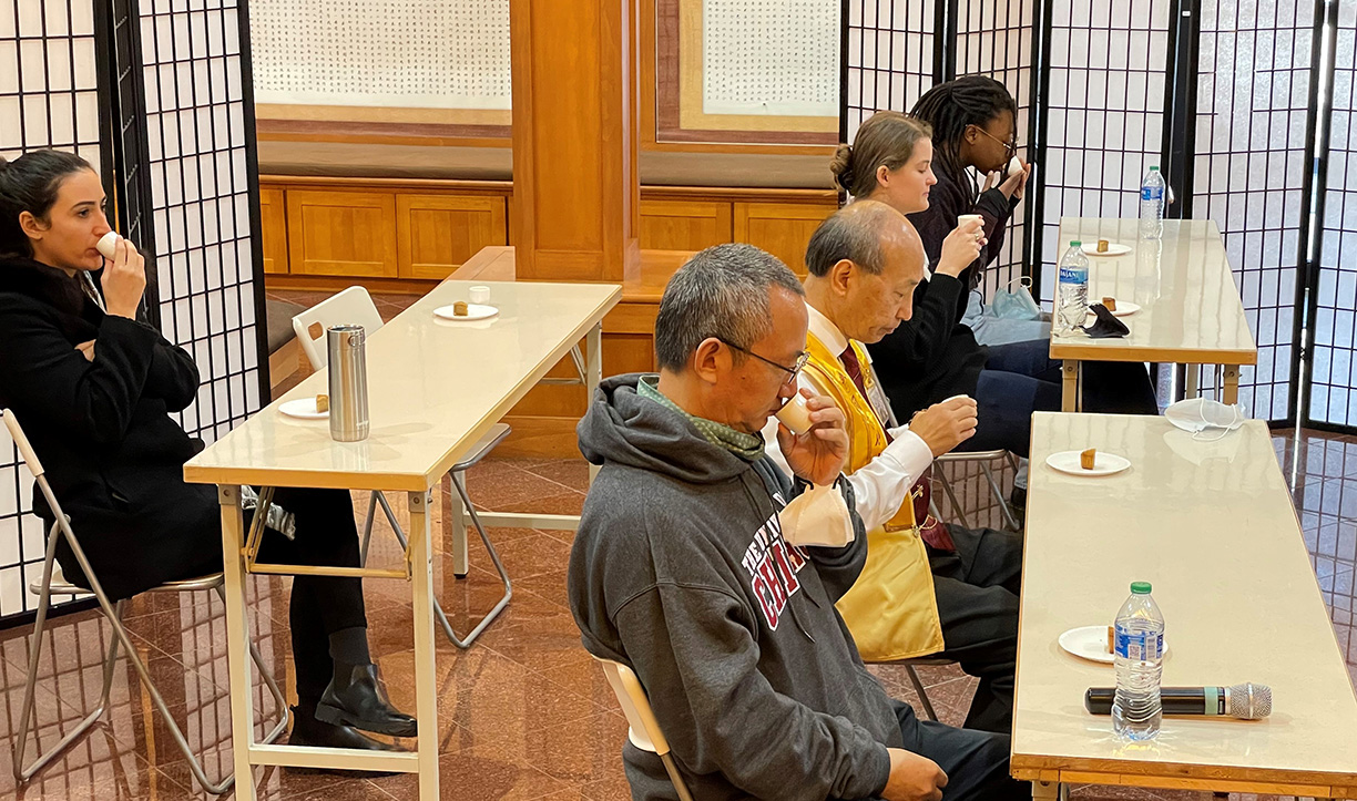 靜心茶禪,參透禪悅法喜。覺麟法師以三杯茶和一杯開水,要大家仔細體察每杯茶和水的味道,來體悟當下的心。並以參禪之初「看山是山,看水是水」,參禪之中「看山不是山,看水不是水」,參禪徹悟後「看山還是山,看水還是水」説明參禪三境界。茶禪是同學們最喜歡的活動,好奇地詢問泡的是什麼茶?有沒有線上的禪修班可以參加?同學們第一次專注地六根全用,在品茶的同時,也對參禪有了更深一層的體悟。