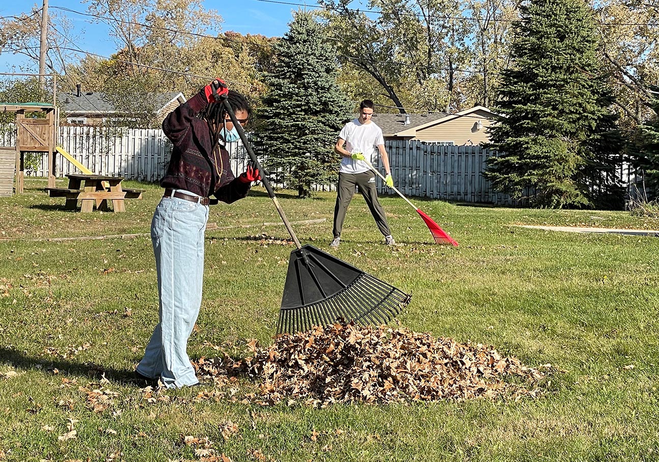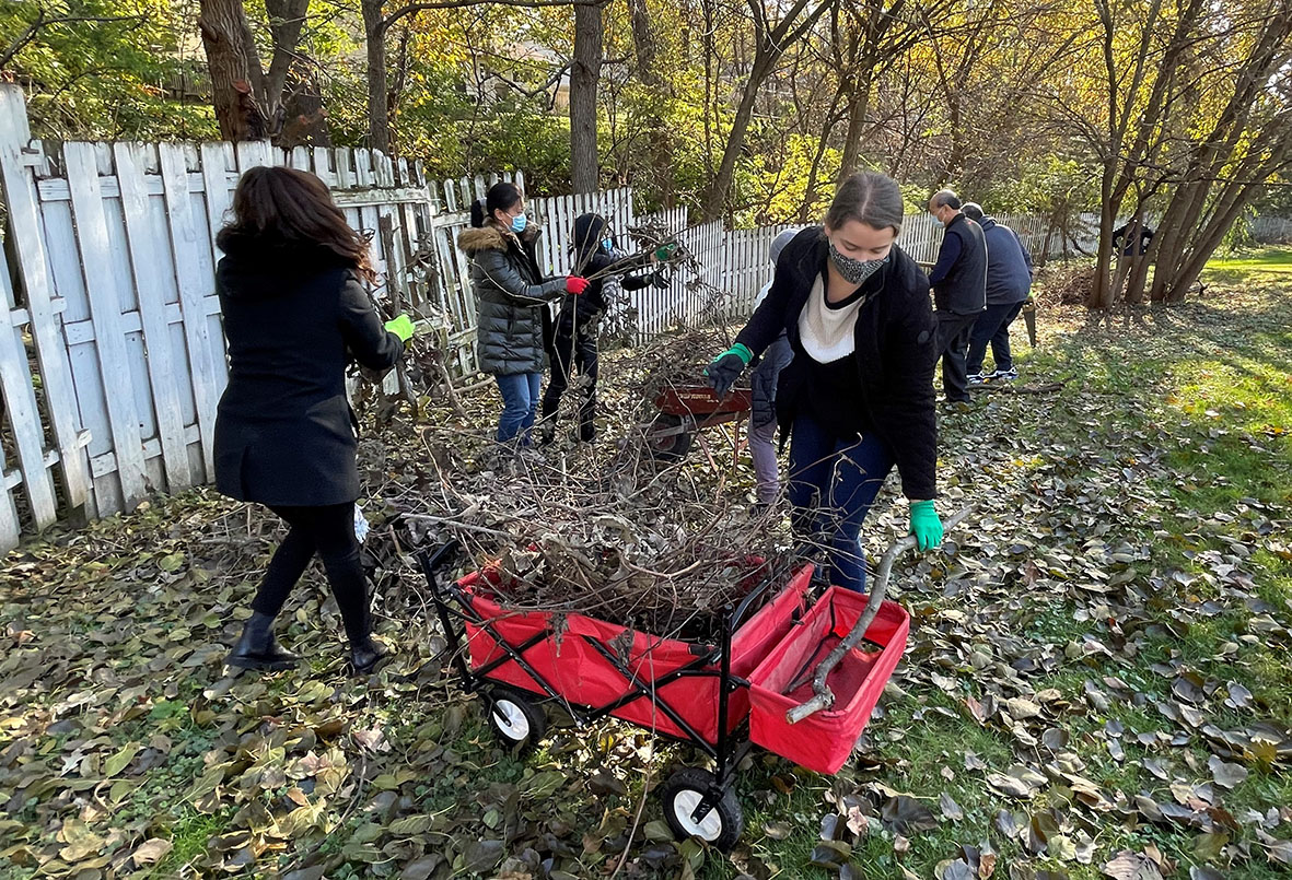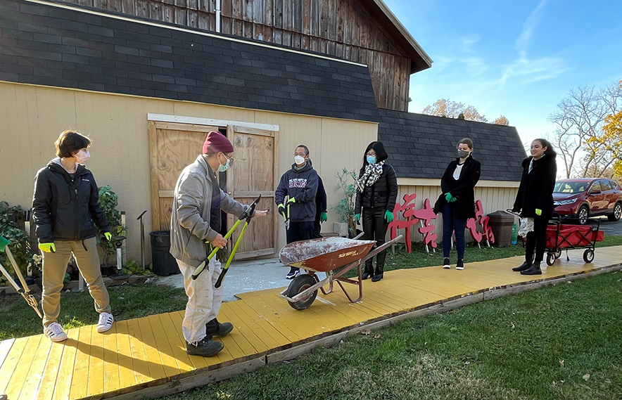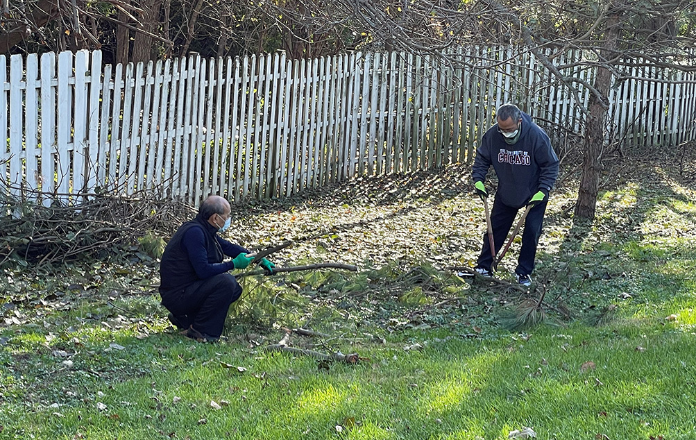 由靜到動,同學們出坡作務,幫助道場清理龍捲風之後道場周圍的殘枝落葉。學愚教授和學生們分成剪殘枝組、掃落葉組和搬運組,有條不紊的依序清理搬運,一個多小時後道場四週的殘枝與落葉清理一空。學愚教授感謝常住的精心安排,讓學生們收穫良多,對人間佛教的實踐有了更深的體會。覺麟法師代表常住贈送每位一本英文版星雲大師著作的《人間佛教的藍圖》與新春一筆字墨寳春聯一幅, 歡迎大家日後有緣再來!