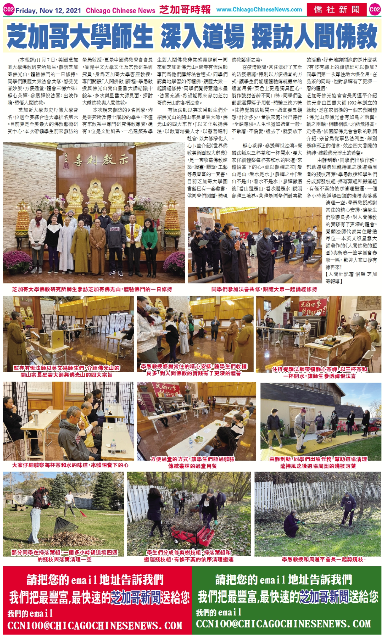 【人間社記著 惜慧 芝加哥報導】11月7日,美國芝加哥大學佛教研究所師生,參訪芝加哥佛光山,體驗佛門的一日修持。同學們跟隨大眾法會共修,感受梵音妙樂,方便過堂,體會三德六味;靜心茶禪,參透禪悅法喜;出坡作務,體悟人間佛教。