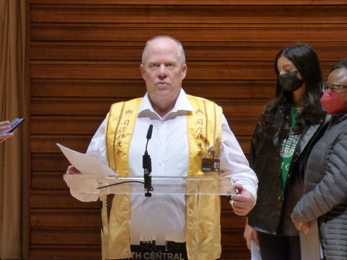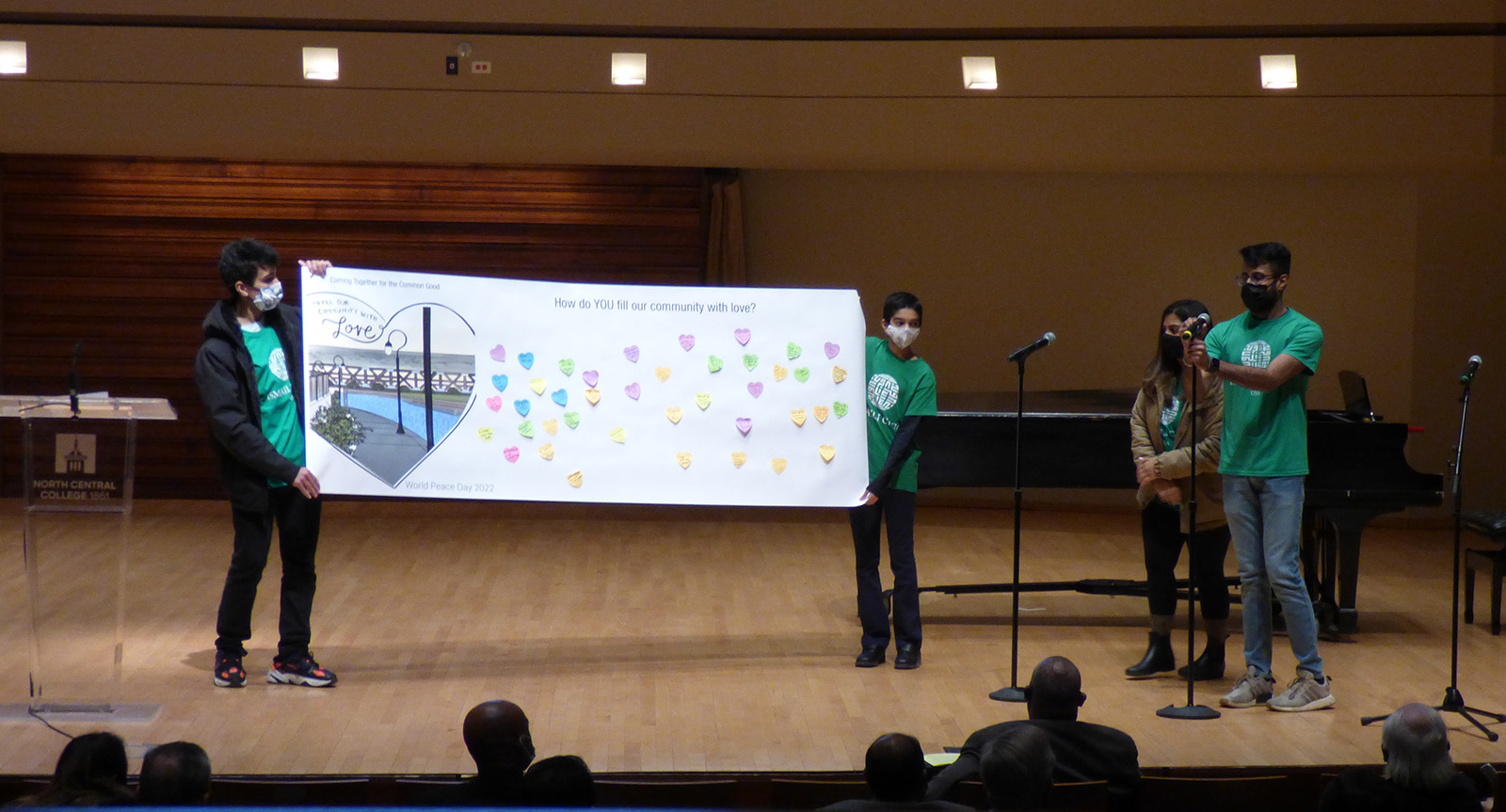 多元宗教為世界和平祈福活動,在主禮嘉賓中北大學(North Central College) 宗教及行動辦公室主任Rachel Pridgen博士與瑞柏市多元及融合辦公室主任Geneace Williams博士致歡迎詞中,正式開始。來自英文分會會長Steven Haverkos 更是作為第一位宗教代表,上台演講。他以佛光山開山星雲大師的〈廣結善緣祈願文〉,帶領與會的百名大眾,祝禱祈福。