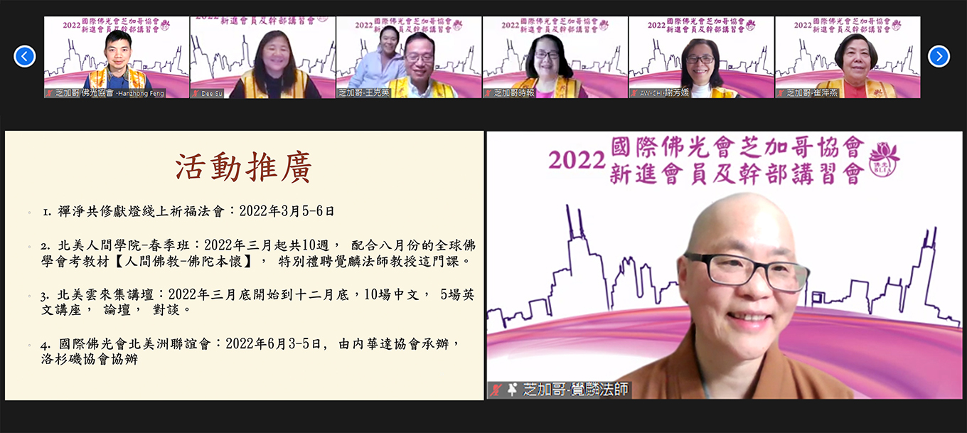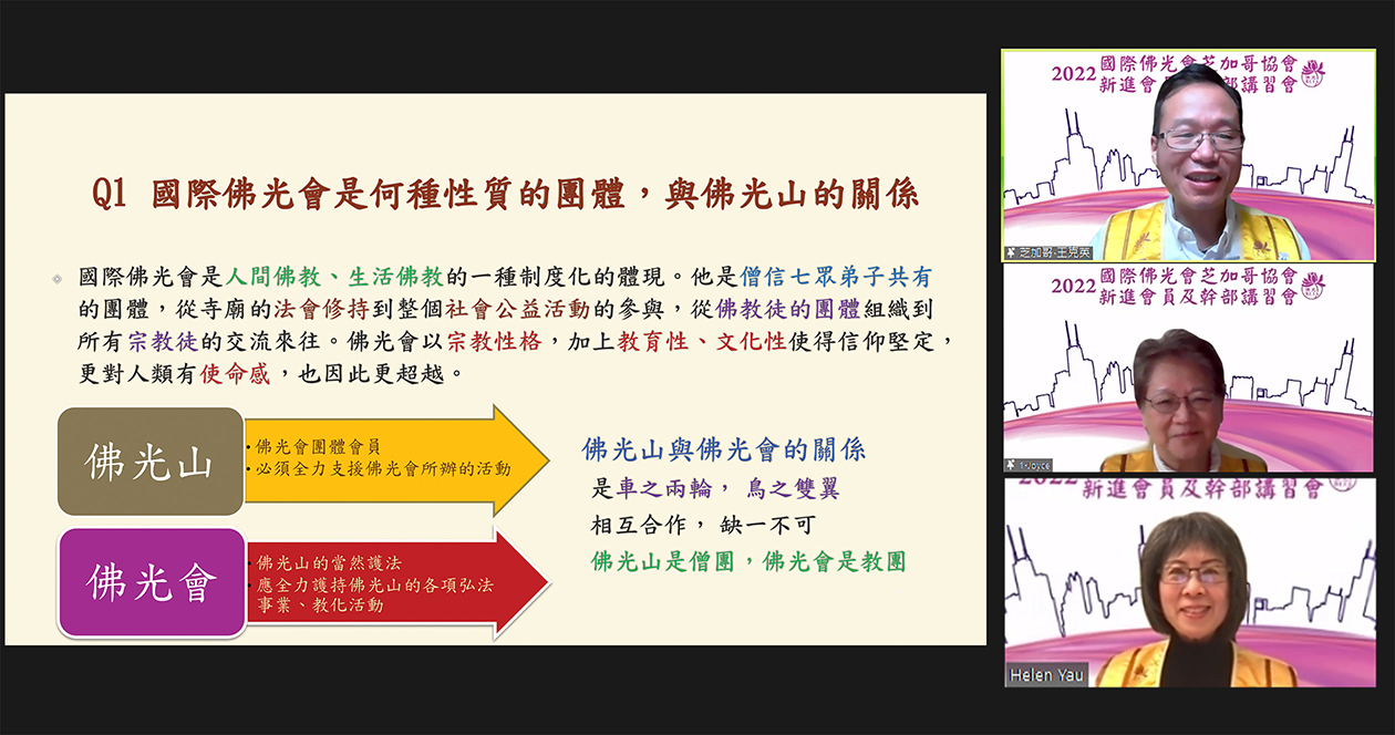 【人間社記者 李昱萱 芝加哥報導】為讓佛光新會員認識了解佛光會的精神理念與社會責任,國際佛光會芝加哥協會,於1月22日舉辦「新會員及幹部線上講習會」,近40人參加。課程中,深入淺出的介紹佛光會的組織與宗旨,並說明佛光會員的權益與義務。