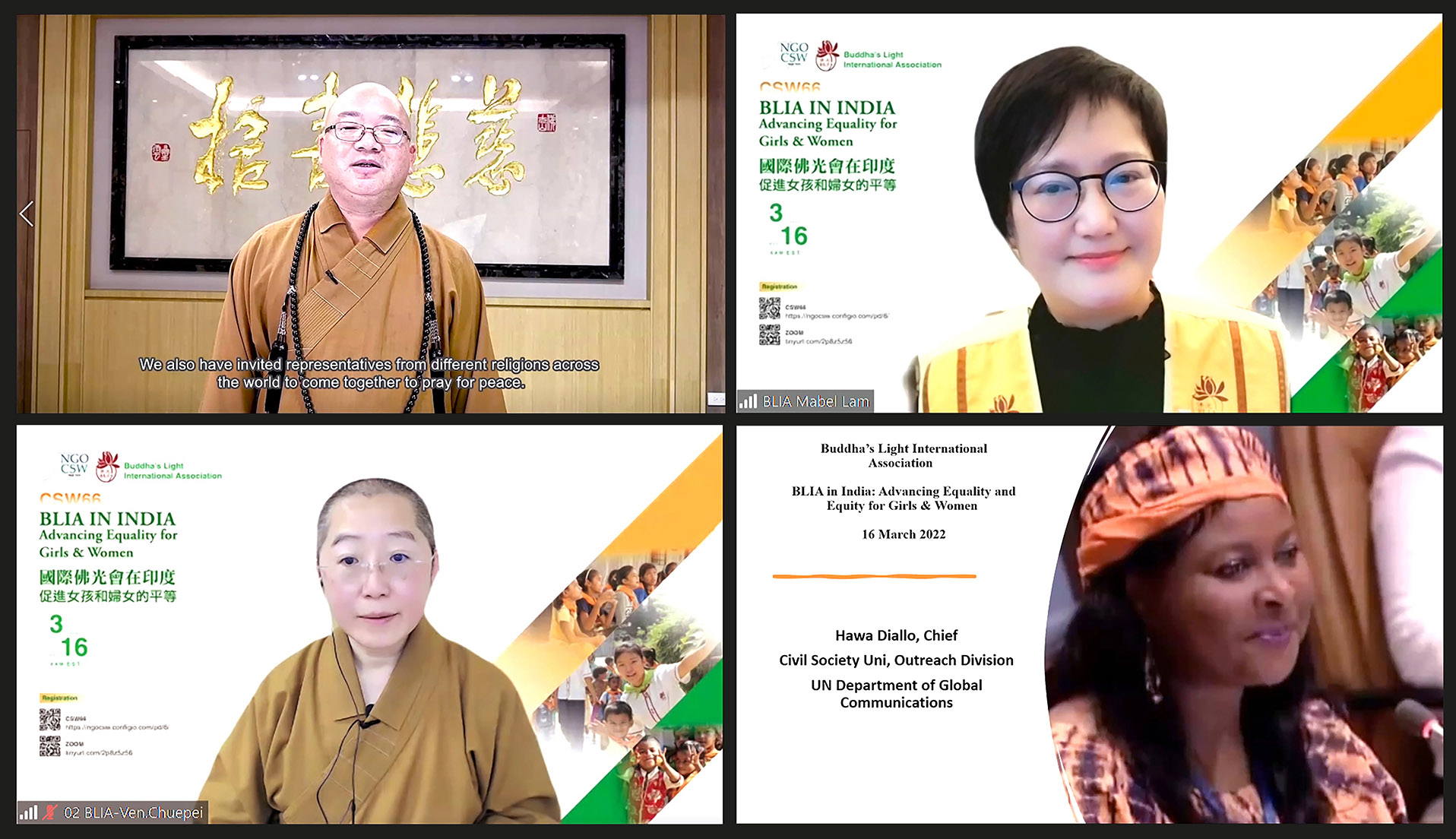 國際佛光會世界總會會長心保和尚表示,國際佛光會對於不同宗教信仰,不同性別和種族之間的平等,給予支持,尊重與包容。聯合國全球傳播部外展司民間社會部負責人迪亞洛(Hawa Diallo),讚揚國際佛光會以各種包容性教育計劃和職業機會,賦予婦女權力,打破社會中的各種偏見,建立婦女平等。