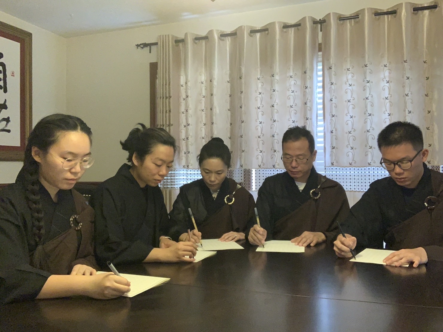 爲了慶祝佛光山開山56週年, 芝加哥佛光山道場在五月十六日下午6點參加全球同步抄經修持,近三十位的佛光人在住持永嘉法師和監寺有恆法師的帶領下,在家著海清搭縵衣, 端身正坐淨心專注的抄寫心經,心中默念經文, 思維法義, 將經文深印在阿賴耶識,行在日常生活當中。