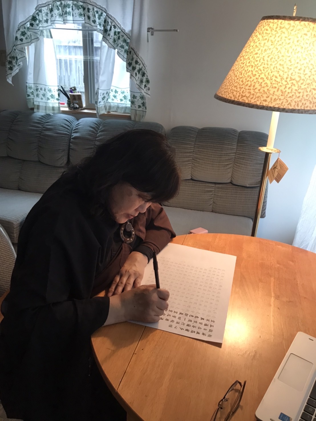 星雲大師開示,誦經是修行,寫經也是一樣, 如同練字讀書一樣,多念就會背誦,印入八識田中,寫經抄經如同在心上烙印, 烙印多了,即心即佛!大師在抄經聞法者的祈願文中為抄經者祈福, 祈求佛陀幫助大家獲得禪悅法喜, 心開意解;人人實踐佛陀法義, 奉行佛陀教誨, 透過抄經聞法讓身邊的親朋好友同霑法喜共享法樂, 一起來浄化人心,美化社會。芝加哥協會副會長王克英帶領同修碧琳師姐和三位兒女一起抄經, 大女兒彬馨,同時也是芝加哥青年分團的召集人分享:抄經能夠清淨身心,是一件很棒的修持,尤其是和父母弟妹全家人一起抄經, 更是難得,法喜充滿!