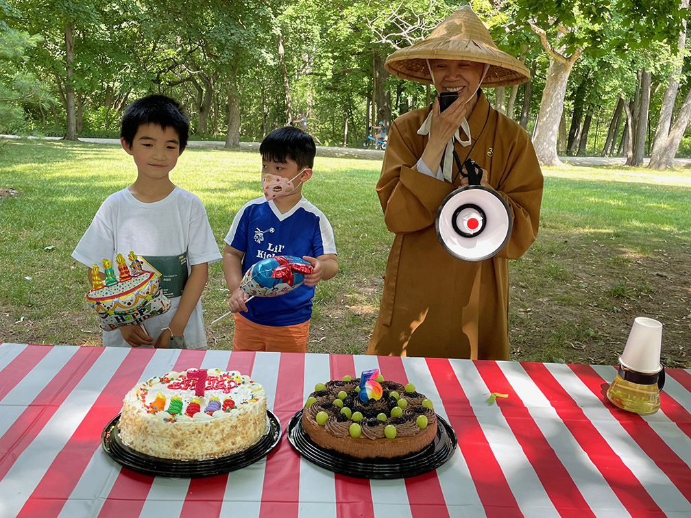 健行/路跑完畢後,每個參予者都品嚐自製的蔬食素食午餐。賀庭芳佛光人表示,倡導蔬食要從自己開始,也很高興自製的素壽司得到讚賞。其後兩位七月份生日的小朋友在歌聲中得到祝福,並請叔叔阿姨,爺爺奶奶們品嚐父母帶來的蛋糕。