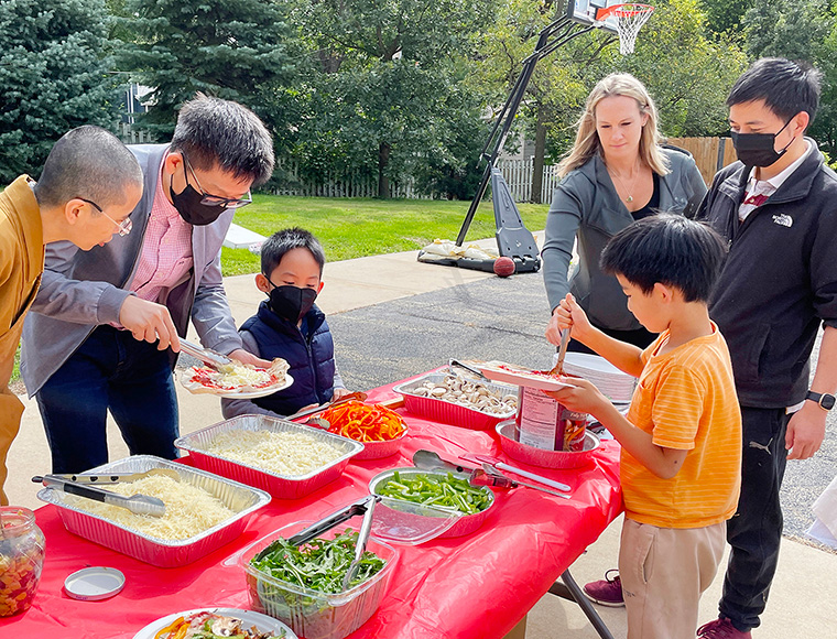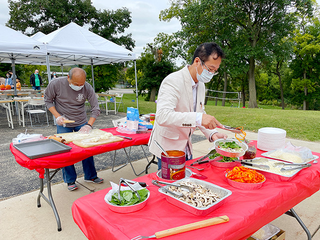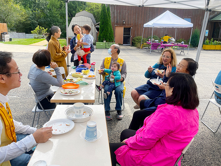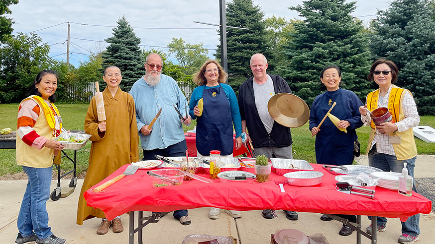 英文分會幹部們集體創作,以既有佛法又能接引本土人士的方式策劃慶祝活動。享用美食前,輔導法師有恆法師帶領大眾,恭誦全英文的「佛光四句偈」。會長Steve Haverkos歡迎大家,並親自掌廚燒烤。為倡導蔬食A計劃,幹部Vanessa Kwok和Lauren Pittelli特地從自家果園和當地農場挑選了香甜玉米、蘋果等應節蔬果。她們讚歎到:看到大家的歡喜參與,希望人間佛教本土化,走出芝加哥的獨特風格。