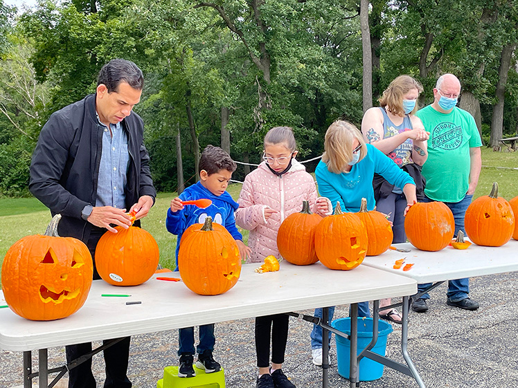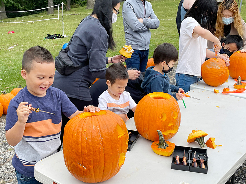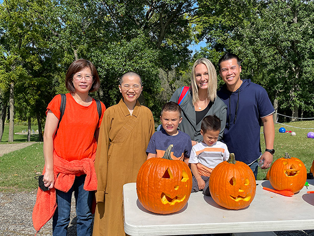 童心未泯的白人老夫婦和許多民眾都是第一次參與,他們是道場的鄰居常常開車路過,卻遲遲不敢走進來。其實對佛教充滿了好奇,看到舉辦傳統是豐收佳節,不約而同地來雕南瓜慶祝秋收。發現需要開拓視野,更報名參加英文讀書會,開始接觸佛法。Jose Rivera醫生接觸佛教不到半年,經常參加線上英文讀書會,對於此次的活動尤為感動,非常有意義,可以讓自己的一雙兒女接觸佛教,看到佛法的實踐,給的歡喜,感受著人間佛教快樂的一面。