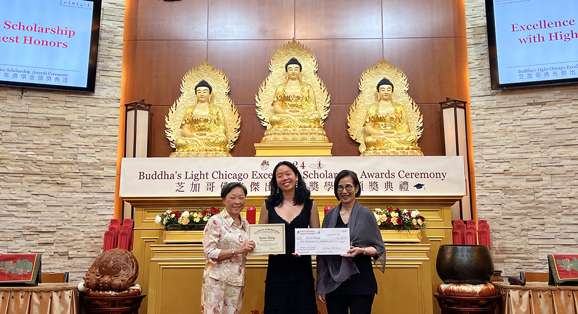 此次12 位受獎者全部入選其學校譽院長名單(Dean’s List)。Karen Wang 為芝加哥佛光協會王克英會長和倪碧琳的千金。她以極優等榮譽(Magna cum Laude)從耶魯大學畢業,並將繼續攻讀美國研究與族裔學博士學位。作為芝加哥佛光青年分團副會長,她發願繼續努力宣揚人間佛教的理念,如慈悲、布施、解脫,使我們的世界更加美好。