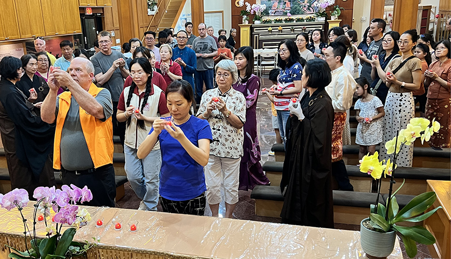 華燈初上, 有恆法師帶領大眾一起在大殿「獻燈祈願」。大眾在聆聽佛光山開山祖師星雲大師的獻燈祈願文聲中,一一恭敬地點亮心燈、獻燈向佛。頓時佛光燭光、光光相映,心燈燭燈、燈燈相續。有恆法師歡迎大家回到法身慧命之家,「月到中秋分外明,每逢佳節倍思親」,這些年來大家在舉辦活動或道業薰習上,猶如從新月到滿月,感恩彼此的成就或磨練,祝福大家福慧圓滿。