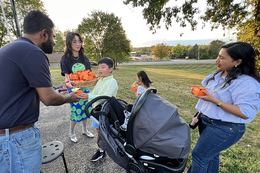 芝加哥佛光山監寺有恆法師領著佛光小菩薩,由小菩薩一一送給每位來賓一份常住的愛心中秋禮盒,由道場義工及李蓓蓓師姐手工製作的月餅、茶點,以及滿滿祝福。