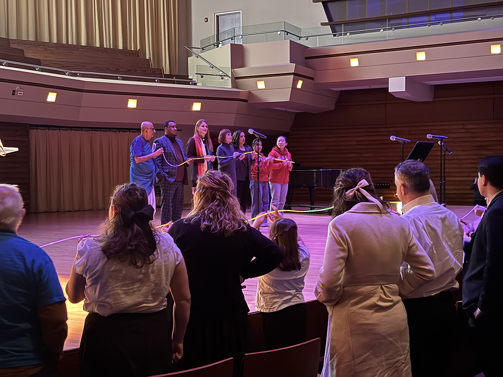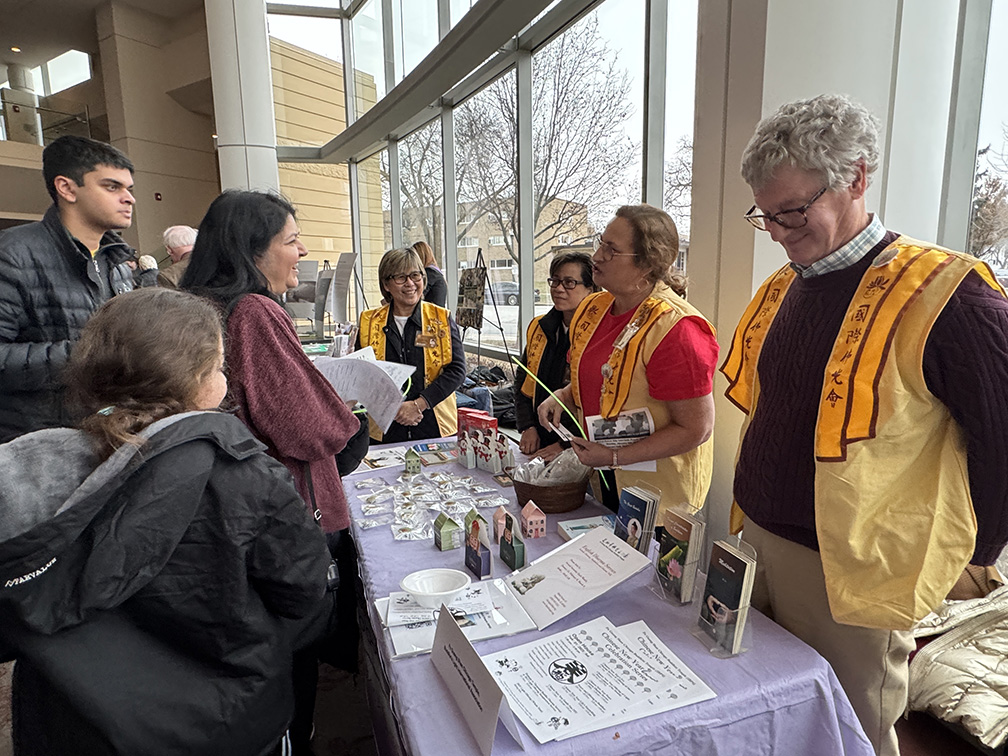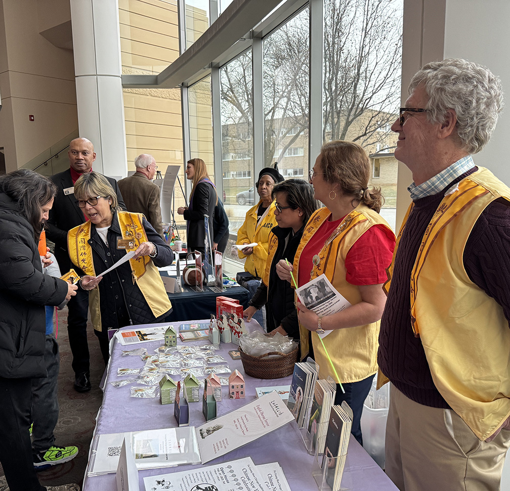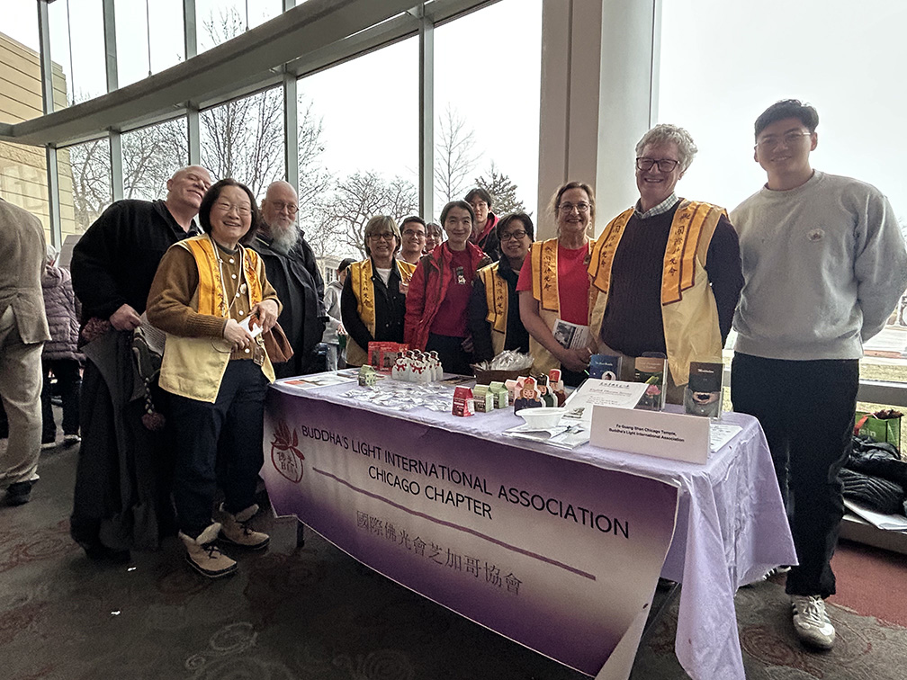 活動尾聲,所有參與者手持光棒串連,象徵和平之光,祈願世界和諧。會後,由英文分會會長Lauren Pittelli帶領,設置展示攤位,介紹芝加哥禪淨中心及國際佛光會,推廣佛光小叢書,並以三好胸針結緣,廣邀大眾參加2月1日的「新春敦親睦鄰 社區歡喜日」。