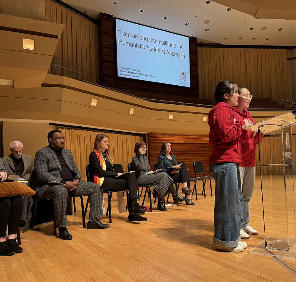 青年團副團長Bea Haverkos與幹部Celine Wang代表上台分享星雲大師的文章《I Am Among the Multitude》,闡釋人間佛教「我在眾中」的智慧。他們以佛光青年分團為例,深入剖析人間佛教的不同層次,並說明其在日常生活中的實踐方式,兩人簡短而有力的講演,生動詮釋了當天主題,贏得在場觀眾的熱烈掌聲。