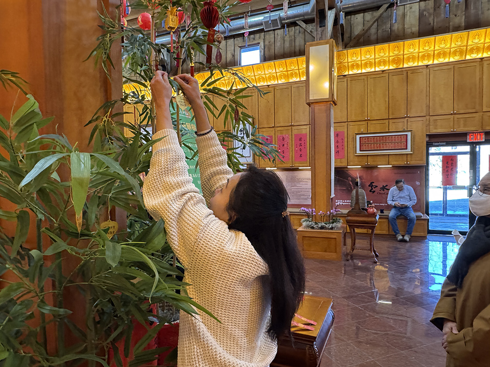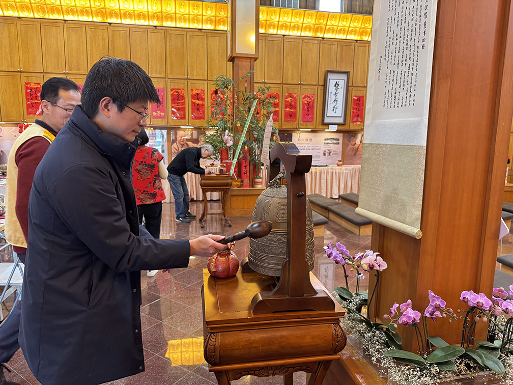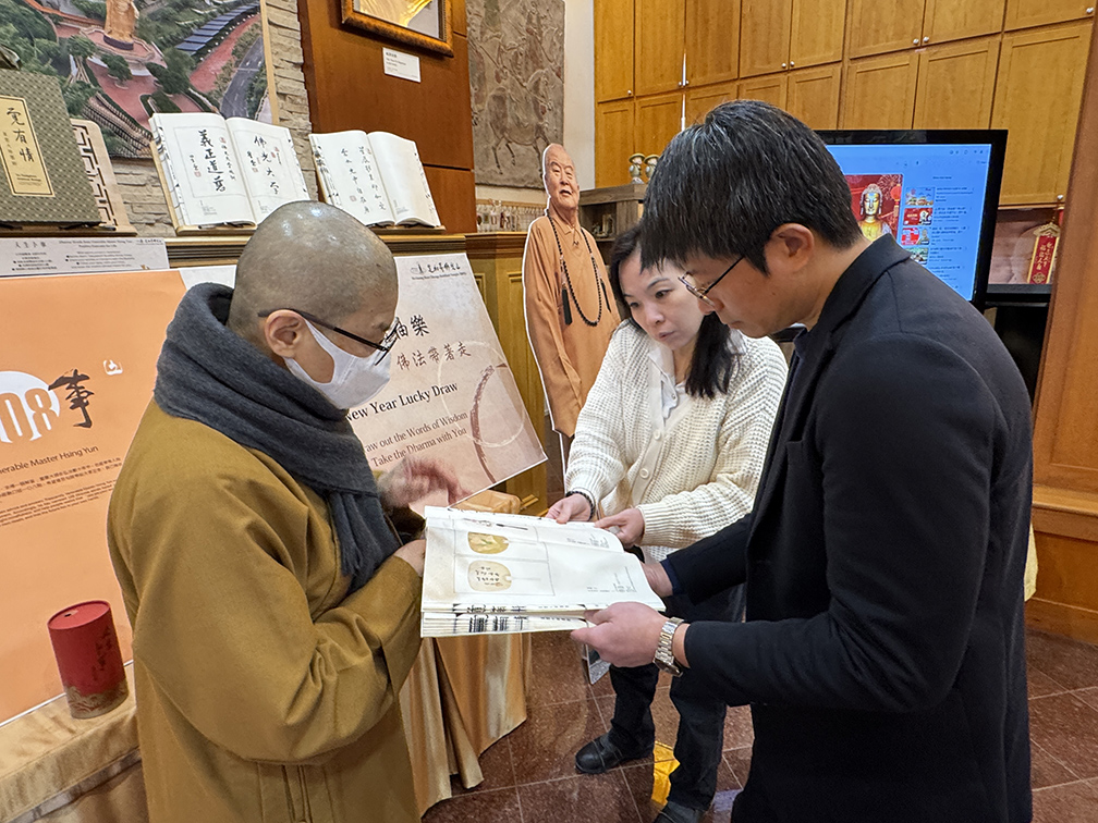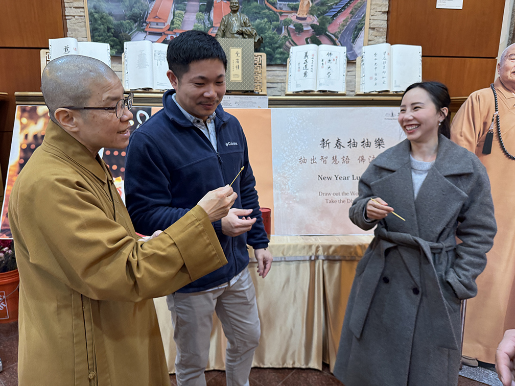 來賓們亦在「人生卜事」攤位抽取星雲大師法語,永瀚法師說明,大師的「人生卜事」不占吉凶,而是融合其佛法體悟與宗教智慧,能作為人生座右銘,啟發前行方向。隨後,眾人填寫祈願卡掛於祈願樹上,並參與敲平安鐘祈福、點燈供佛,祈願國泰民安、社會和諧、世界和平。