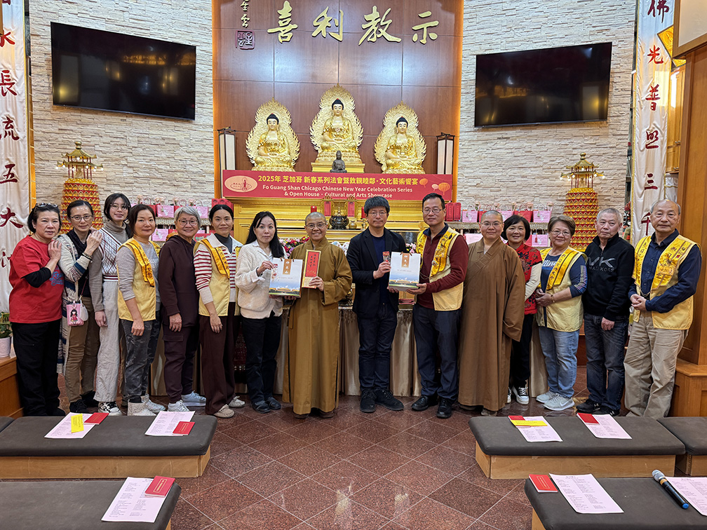 1月28日除夕當天,芝加哥僑教中心主任蔡季穎、副主任陳怡珍及資深義工們共聚一堂,圍爐享用團圓火鍋,迎春接福。住持永瀚法師向來賓們介紹1952年星雲大師的珍貴手稿,其中大師自述希望在黑暗中給人星光,並欣賞「雲」的飄然與自在,因此自號「星雲」。大師一生精勤不輟,自許「人生三百歲」,珍惜並善用每一刻零碎時間,因此能夠完成練字、會客、講說或與弟子談心等各種事情,數十餘年如一日,持續不輟。
