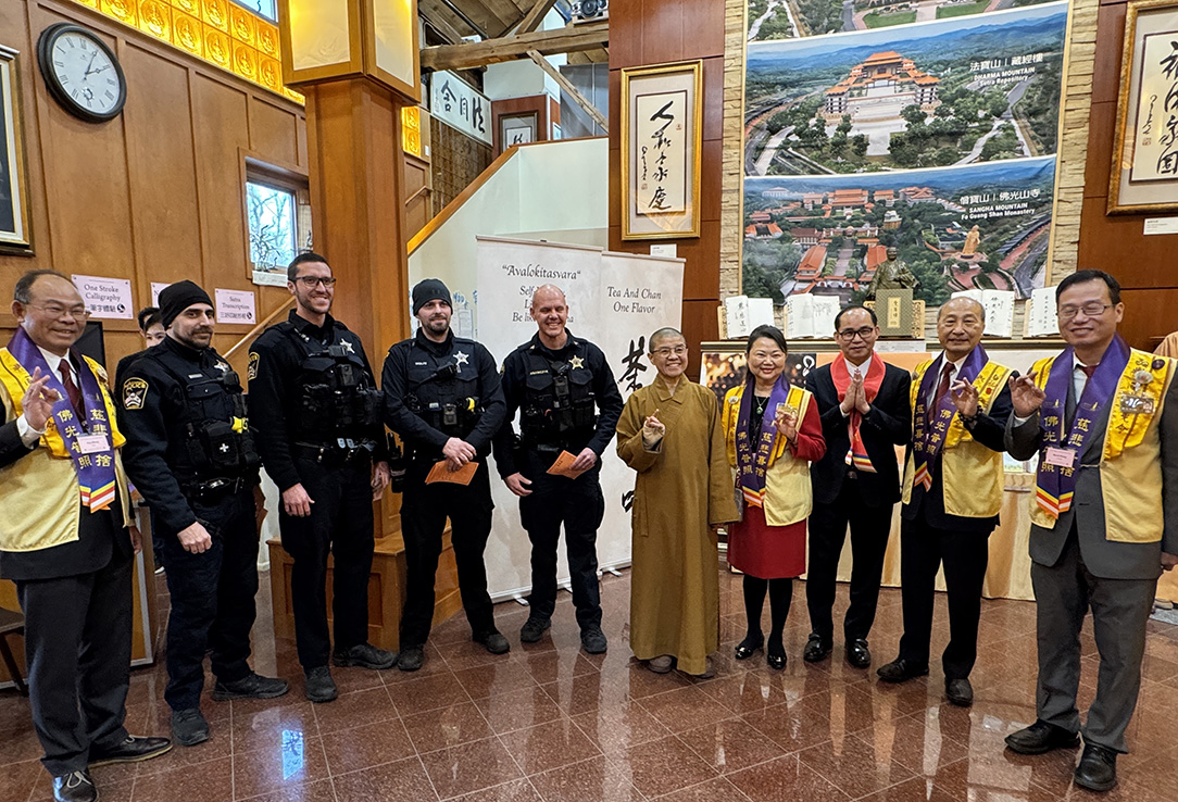 住持永瀚法師感謝來賓們及社區警消人員, 長期以來對芝加哥佛光山的護持,並贈送星雲大師的墨寶匾額「雲水自在,祥和歡喜」以表謝意。法師期許未來道場能將這一如雲與水般自在流動、無所不達的行佛理念,融入社區服務,為大家帶來更多元且豐富的在地支持,並在當前社會人心不安的時期,創造更多的祥和與歡喜,為每個人帶來希望與安寧。