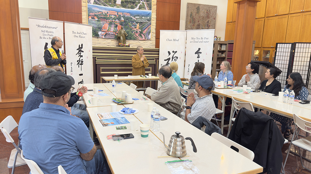 接續,由住持永瀚法師帶領進行「茶禪一味」體驗,引導來賓透過眼、耳、鼻、舌、身、意六根的覺知,觀察茶葉舒展、聞香、品味,學習專注當下、覺察身心,領會「當下即是最美好」的禪修智慧。法師並以星雲大師墨寶「雲水自在」四字,祝福眾人身心安穩、自在喜樂。