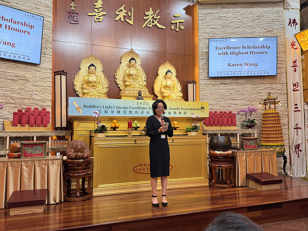 典禮中特邀佛光青少年演奏大提琴,展現才藝。九位獲獎學生中,其中現任芝加哥佛光青年團團長Karen Wang去年以極優等榮譽(Magna cum Laude)畢業於耶魯大學,目前繼續在南加州大學攻讀美國研究與族裔學博士學位;她分享,深受星雲大師「我是眾中之一」理念啟發,期望透過學術研究,實踐佛教慈悲、布施、平等與包容的精神。