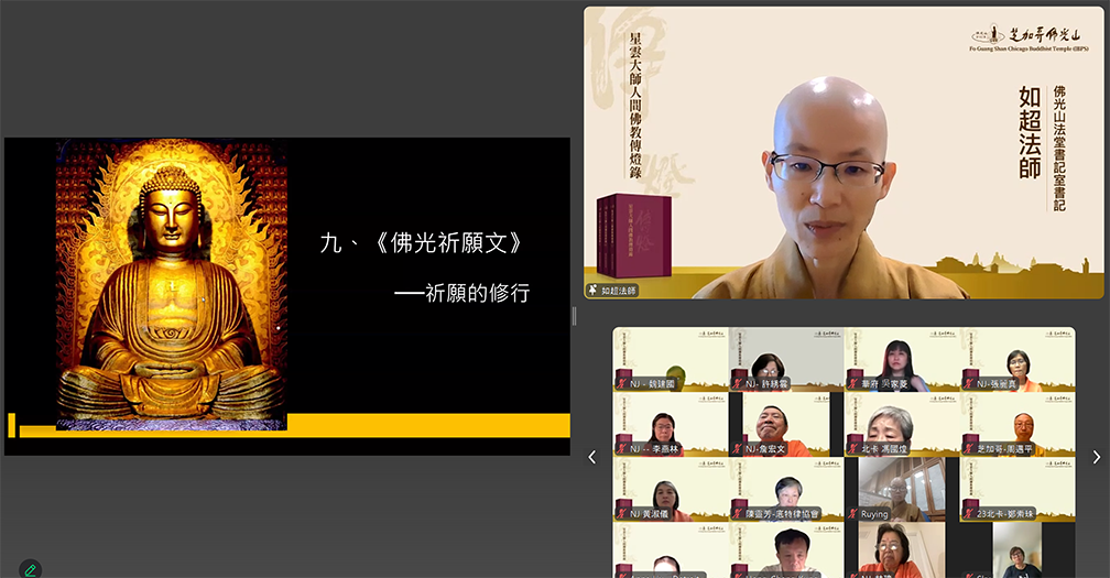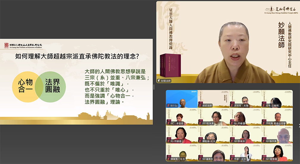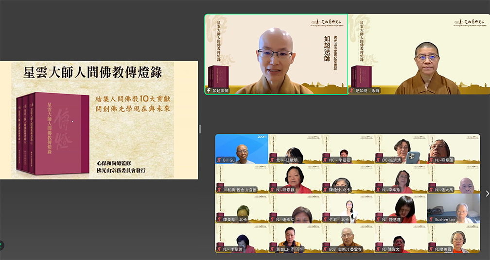 芝加哥佛光山主辦《星雲大師人間佛教傳燈錄》專題講座第三場,於6月27日在線上舉行。此次講座禮請現任人間佛教研究院研究中心主任妙願法師與法堂書記室書記如超法師主講,芝加哥佛光山住持永瀚法師主持。有芝加哥、北卡、新澤西、底特律及美東各地的佛光人近百人線上齊聚,共沐法喜。